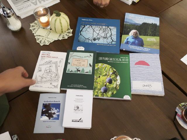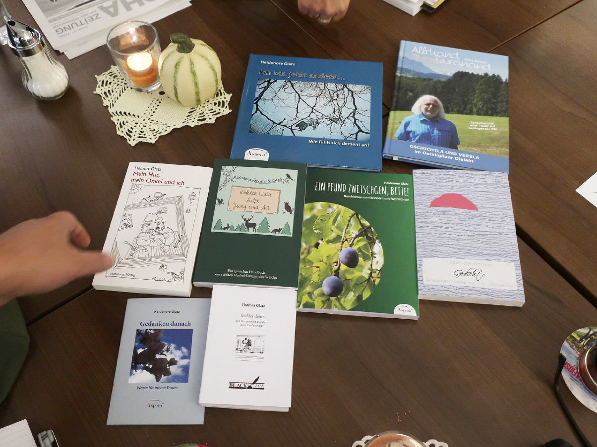 Heidenore Glatz kann gleich mit mehreren Veröffentlichungen aufwarten. Sie schreibt über Traurigkeit, Sehnsucht nach einem verlorenen Menschen, den tiefen Schmerz bei Verlusten: „Gedanken danach – Worte für meine Trauer“ heißt ihr kleines Gedichtebüchlein. In dem Band „Ein Pfund Zwetschgen, bitte!“ finden sich „Geschichten zum Erinnern und Wohlfühlen“, voller Trost, Hoffnung, Heimat, nicht zuletzt gedacht als Hilfe im Umgang mit alten Menschen und Demenzkranken.