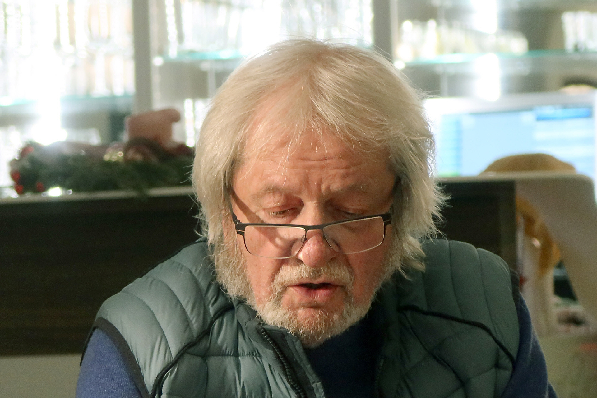 Überwältigt von der Vielzahl der Beiträge setzt sich am Schluss der Moderator selbst in den Schein der Leselampe. Auch Heiko D. Felbrici hat etwas dabei: die Geschichte des Fotos, das seine Einladung zierte, ein Winterspaziergang. Der Frost formte lange Eiskristalle in den Büschen, das Dorf war idyllisch verschneit, eine Brücke führte über den Bach mit seinem „Glitzern wie ausgestreute Diamantsplitter“ – der Winter ist ein Künstler, der unser Auge in diese Schönheit reinzieht. Doch die Fotos davon wirken flach, „meine Enttäuschung will mir die Freude nehmen“. Sie können nur beim Erinnern helfen: reifbehängte Zweige im Wasser, ein Baum im Bild. Schönheit in Vollkommenheit macht trunken, lädt ein zu einem stillen Gebet und dem Heimweg in Frieden.